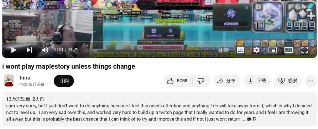 然而這之後的故事,卻跟大家想象的有些不太一樣。當Niru的經驗條走到99.993%時,他停下了手上的動作,暫時退出了遊戲,並針對《冒險島》近期的內容和運營方式發表一些批評,像是普通區的體驗差勁,根本原因是地圖設計糟糕,BOSS掉落的魔方無法交易,且普通區魔方定價過高,商城每月出售物品毫無作用,而稀缺資源又被惡意哄擡物價……