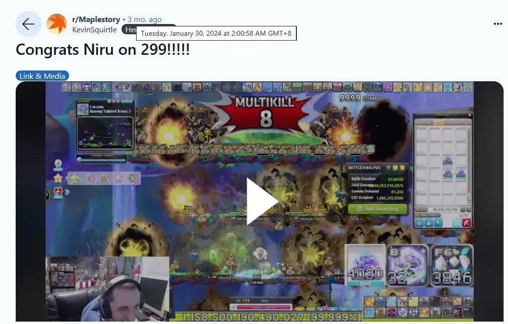 Niru的毅力大家有目共睹,包括《冒險島》官方運營在內,幾乎所有人都相信他會是全球首位到達300級的玩家。4月25日,Niru的角色等級達到了299.98919級,不出意外的話,這場持續了34個月的馬拉松將在這天晚上抵達終點。