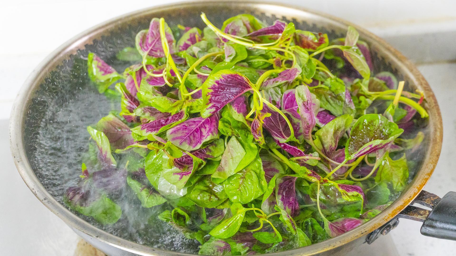 1、起鍋燒水,水開加一勺油和一勺鹽,然後放入莧菜焯水,大火燙30秒就夠了。