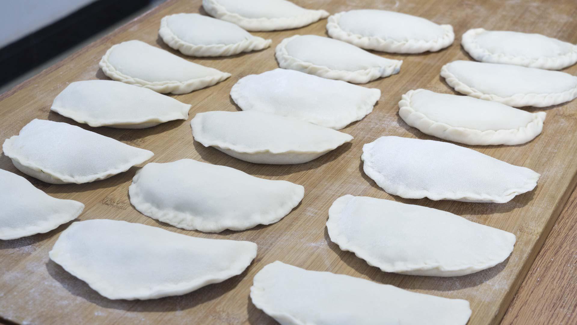 7、麪皮對摺後封口,可以直接在砧板上壓緊實,也可放好餡兒後先把中間捏在一起,然後再分別捏兩邊,全部捏緊實後就可以了,韭菜盒子的生胚就做好了;