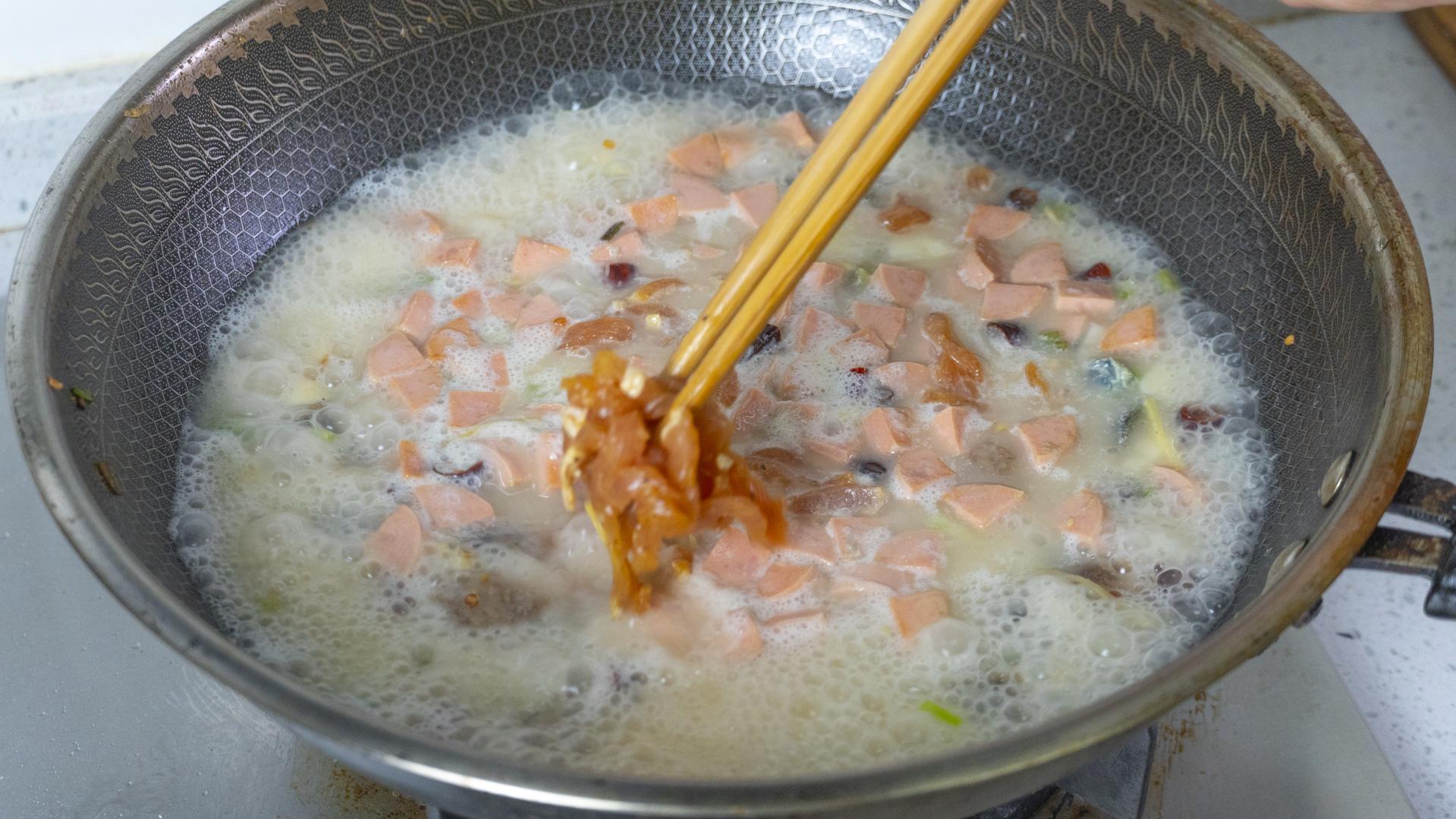 2、倒入開水熬煮3分鐘,至湯變白;