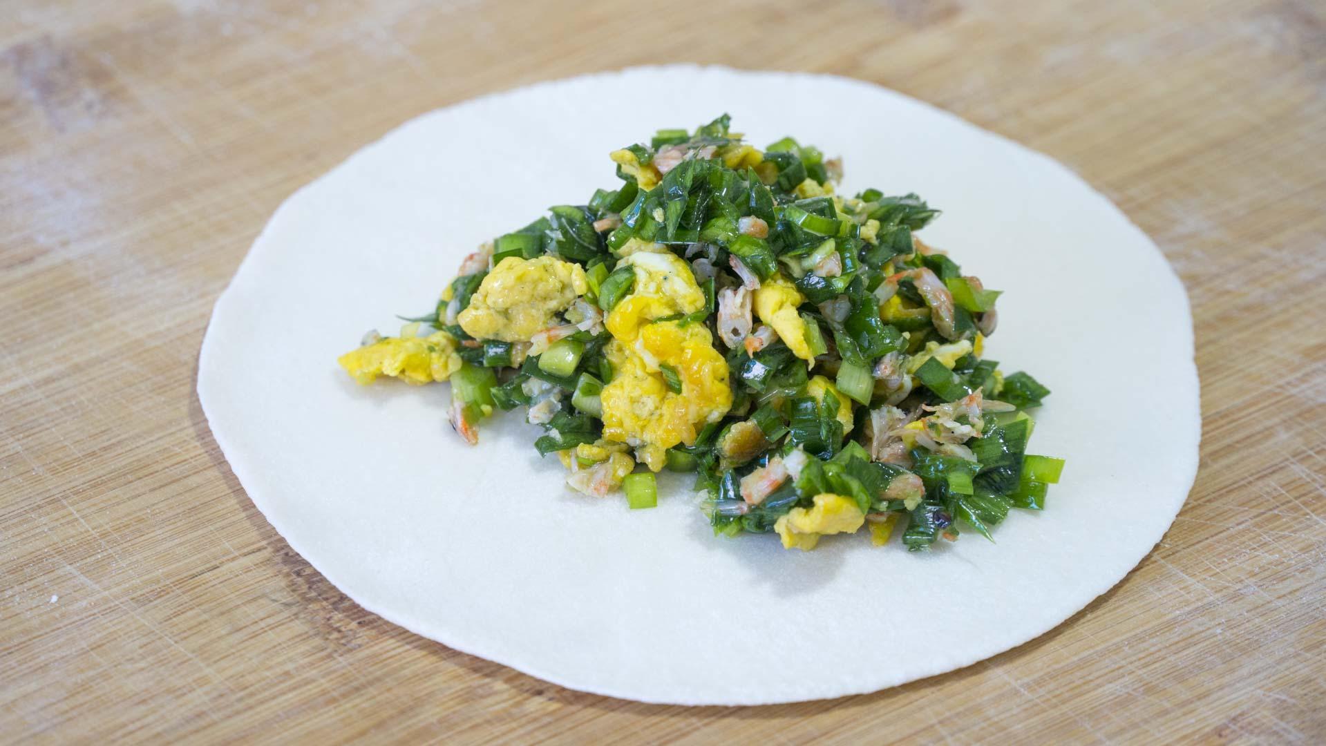 6、取一個面劑子擀開擀薄,麪皮可以稍微的擀薄一點,擀一個就包一個,擀好的麪皮中間放上一大勺韭菜餡兒,