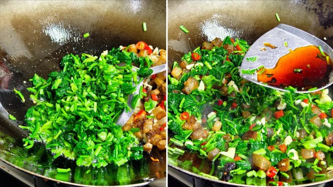 4、接着把薺菜倒進來翻炒均勻,調味加生抽、胡椒粉就可以出鍋了。