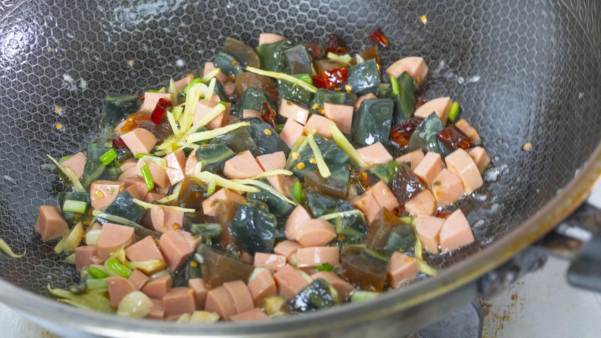 5、起鍋倒油,油熱下蔥、姜、蒜、幹辣椒爆香。接着把皮蛋和火腿也倒進來,大火翻炒一分鐘,把皮蛋和火腿腸炒到有點焦焦的就可以了。