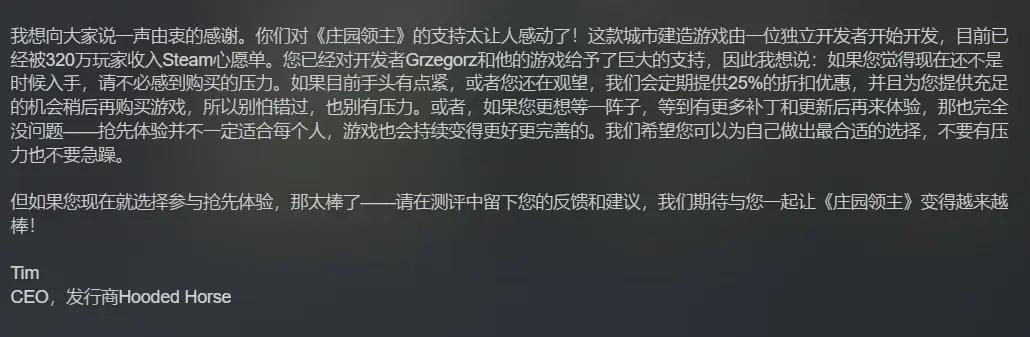除了“本地化營銷”,這位CEO老哥看來也深知“真誠是必殺技”,在官方發佈的發售公告最後,Tim又放上了一些“私人想法”:他建議玩家不要有壓力也不要急躁,不必擔心錯過最佳入手時機——發售初的25%優惠在今後也會不定期“返場”。並且Tim承認遊戲目前處於“搶先體驗”階段,並不適合所有人,等待遊戲完善完全沒問題。