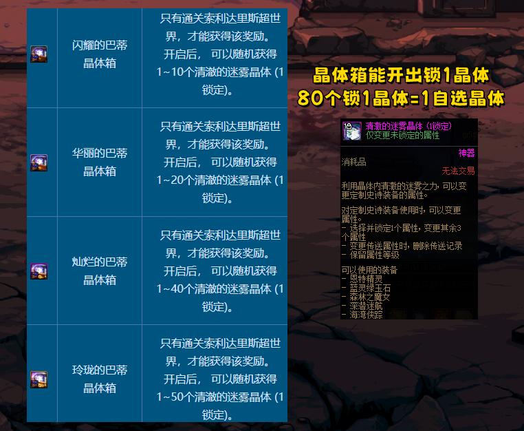 【3】當副本爲“索利達里斯”時,有幾率遇見“巴蒂晶體箱”,打開後可以拿到“鎖1晶體”!