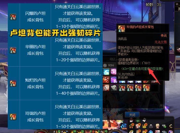 【2】當副本爲“白雲溪谷”時,有幾率遇見“盧坦成長揹包”,打開可以拿到強韌的邊界碎片;