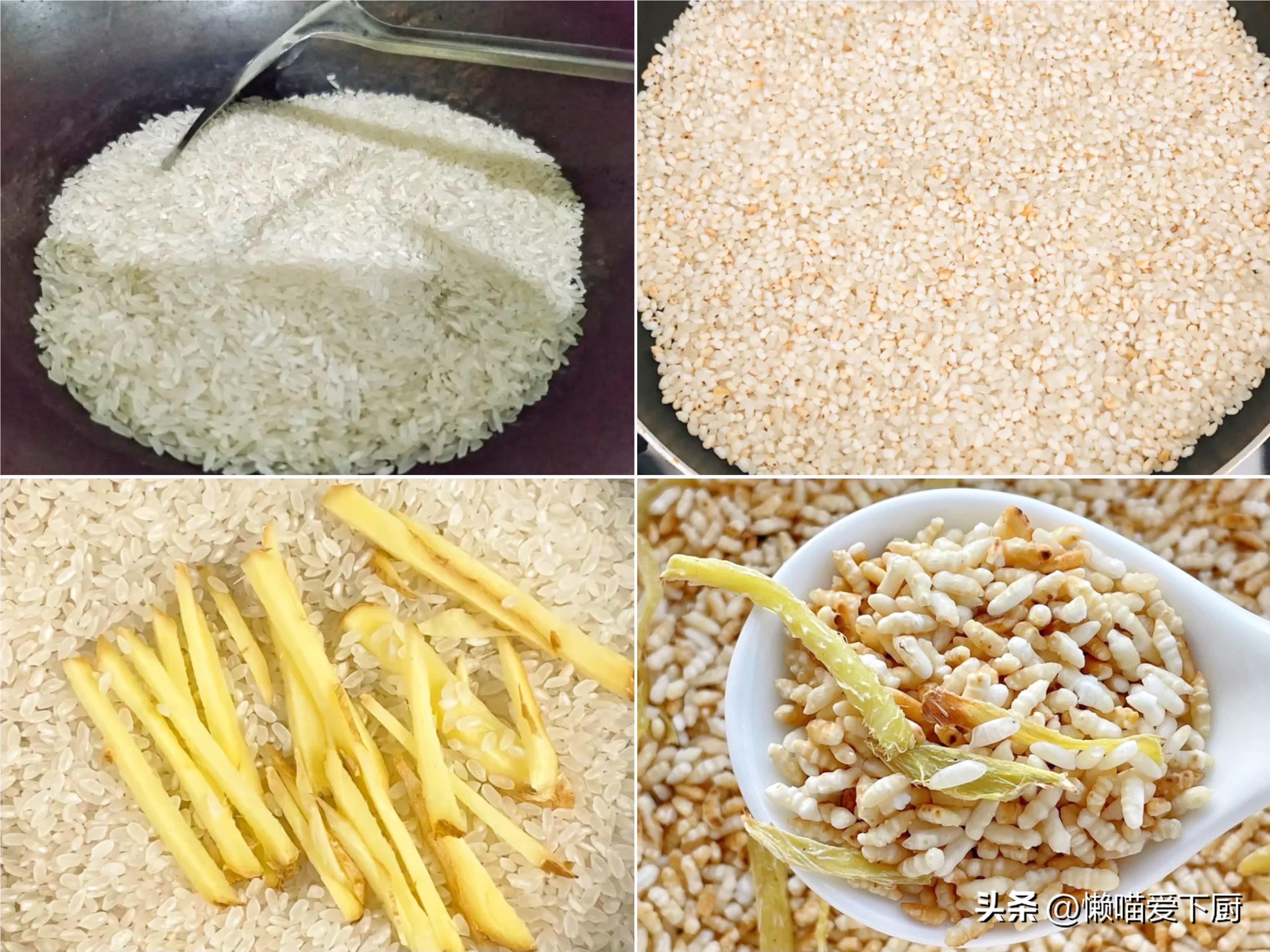 2、小火炒至大米表面泛黃,往鍋中加入適量薑絲;