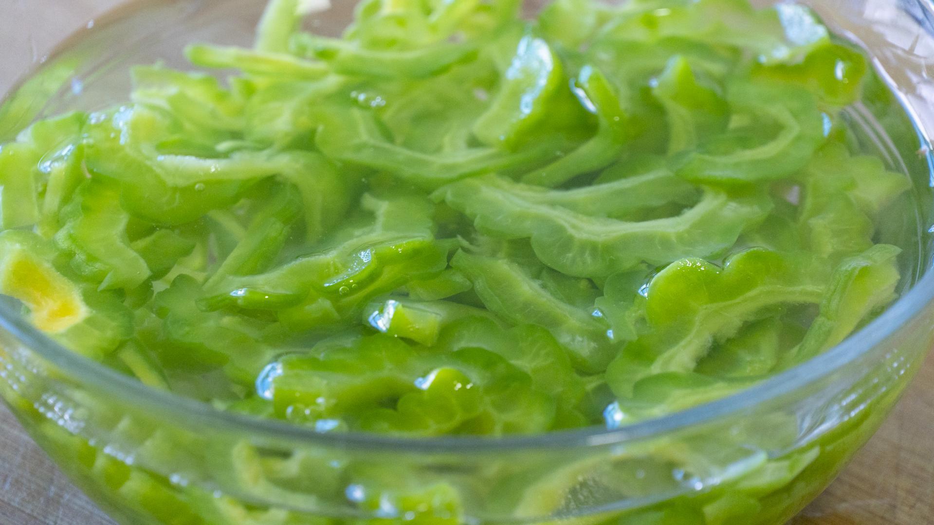 1、苦瓜一條,對半切開後先去籽,然後再切條。切好後裝入碗裏,加一勺鹽醃製10分鐘,醃製出水分和苦味。