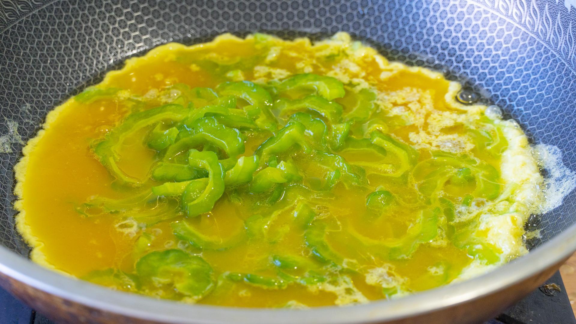 4、起鍋倒油,油熱倒入苦瓜蛋液,用鍋鏟把蛋液從四周向中間推,不用翻炒。