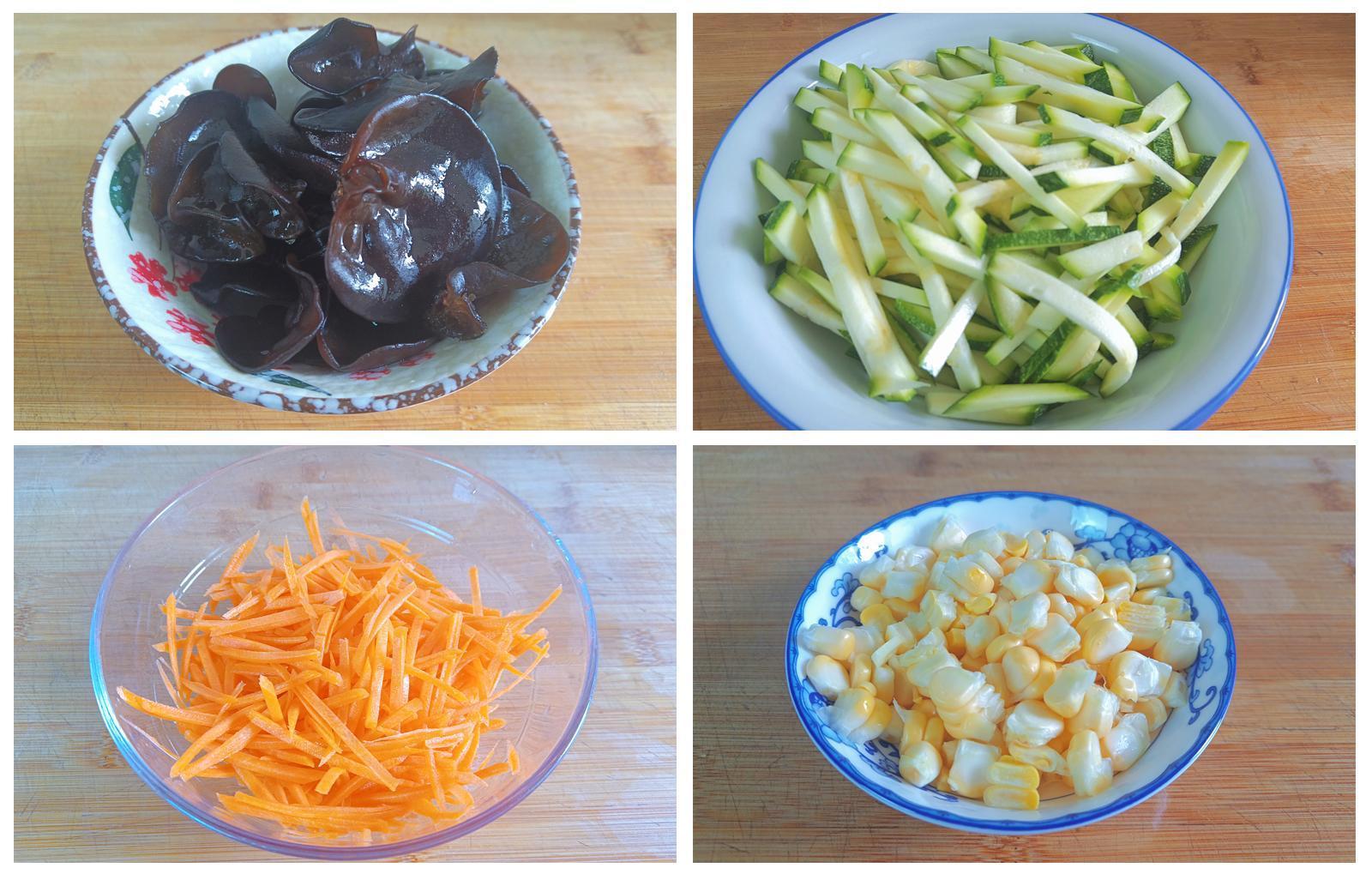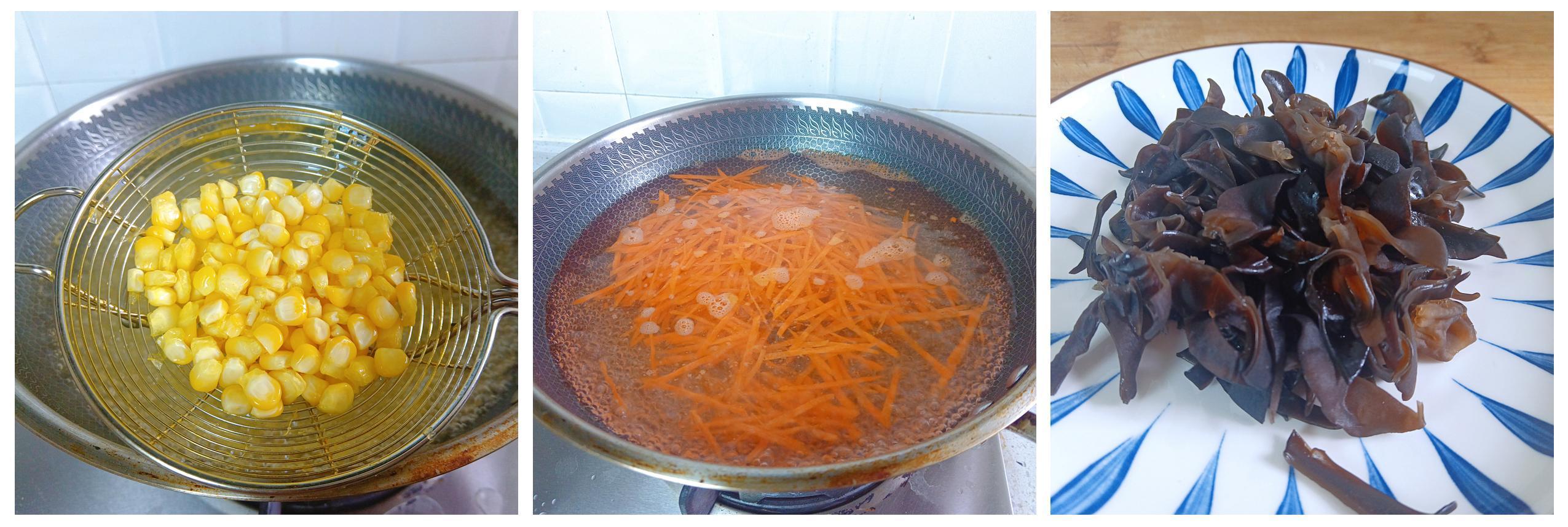 4、接着倒入玉米粒,大火汆湯一分鐘後也撈出來備用,最後把木耳倒進來煮個3-5分鐘,木耳煮熟了就可以了。撈出後放到砧板上,切成細條後備用。