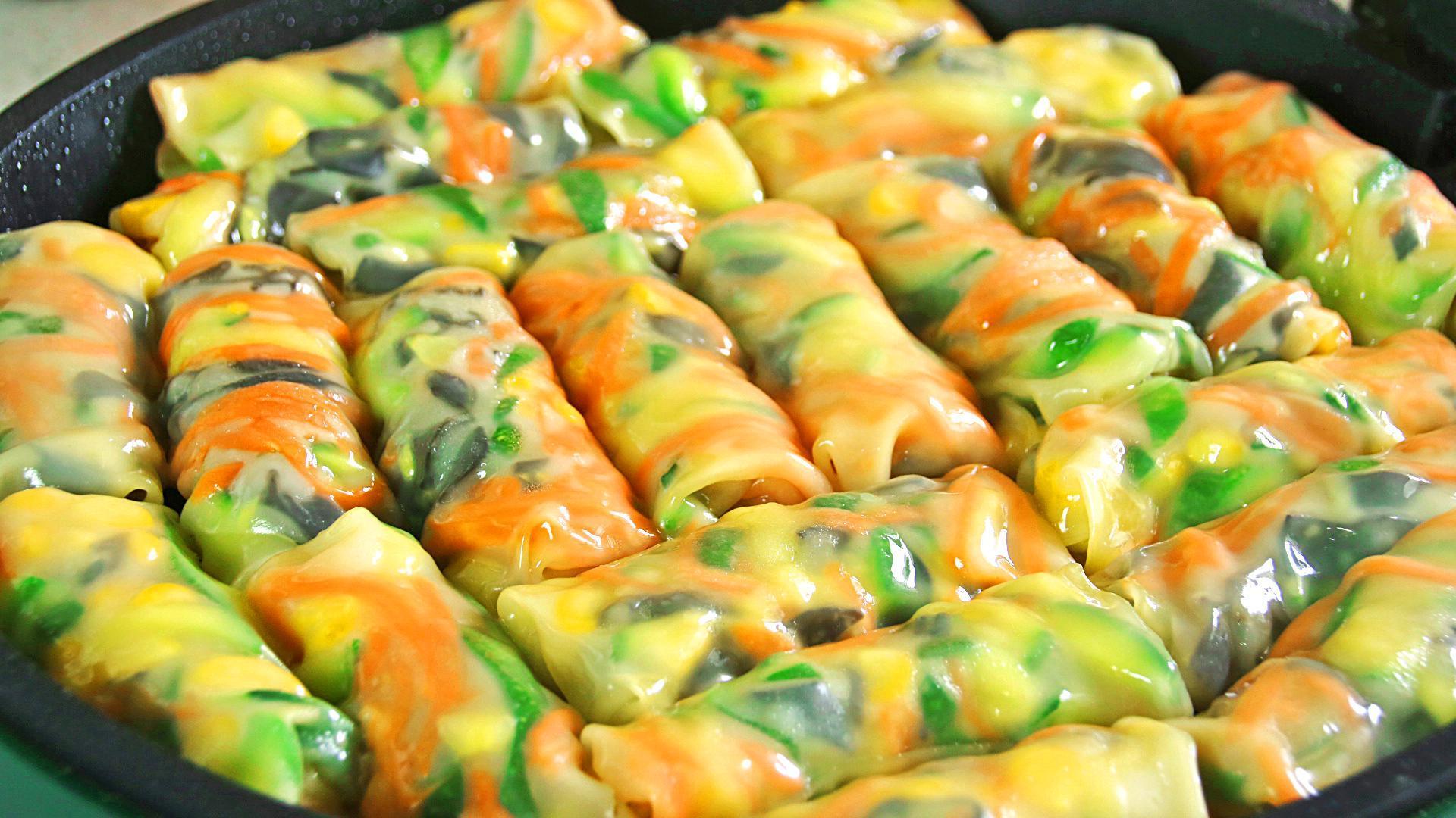 7、蓋上蓋子中火燜3分鐘,這時候蔬菜卷基本就熟透了,顏色也都出來了,非常的晶瑩剔透,如果喜歡喫兩面都是焦焦的就翻個面再煎1分鐘,兩面就都是金黃焦脆的口感了。