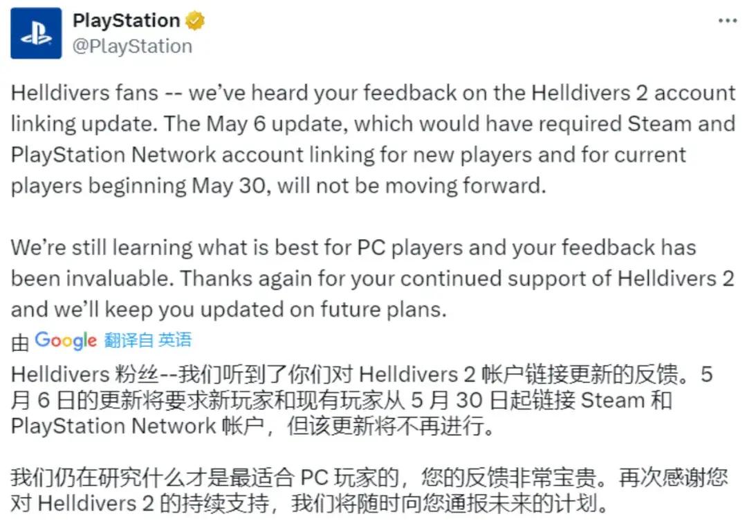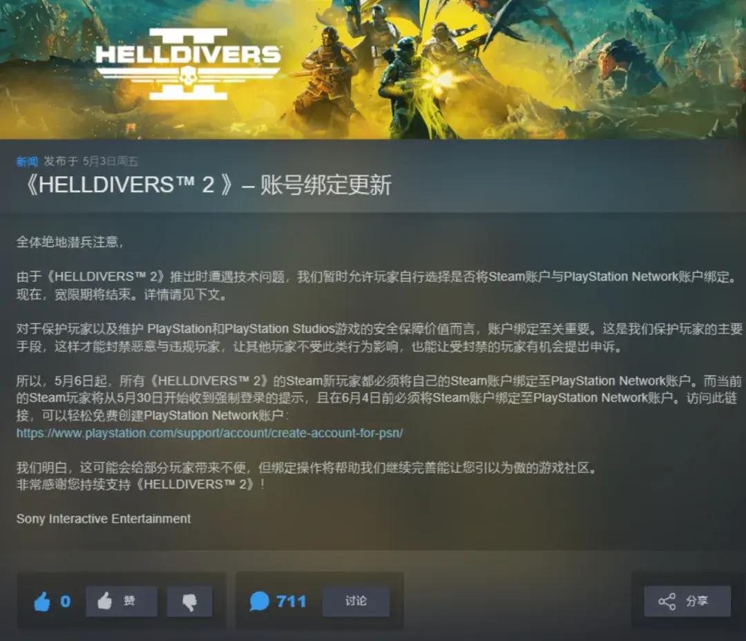 事情發展到這一步,本來差不多就要成爲 “裝死型公關”的又一個成功案例了,但就在這時,索尼又給自己引了波大的——由索尼在Steam上發行的《地獄潛兵2》在已運營了3個月的情況下,發佈公告稱:“寬限期已結束”,接下來所有玩家都必須將自己的Steam賬戶和用於PS主機的PSN賬戶進行綁定,才能繼續遊玩該遊戲。