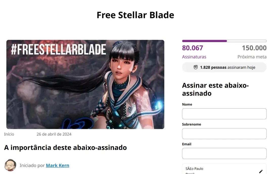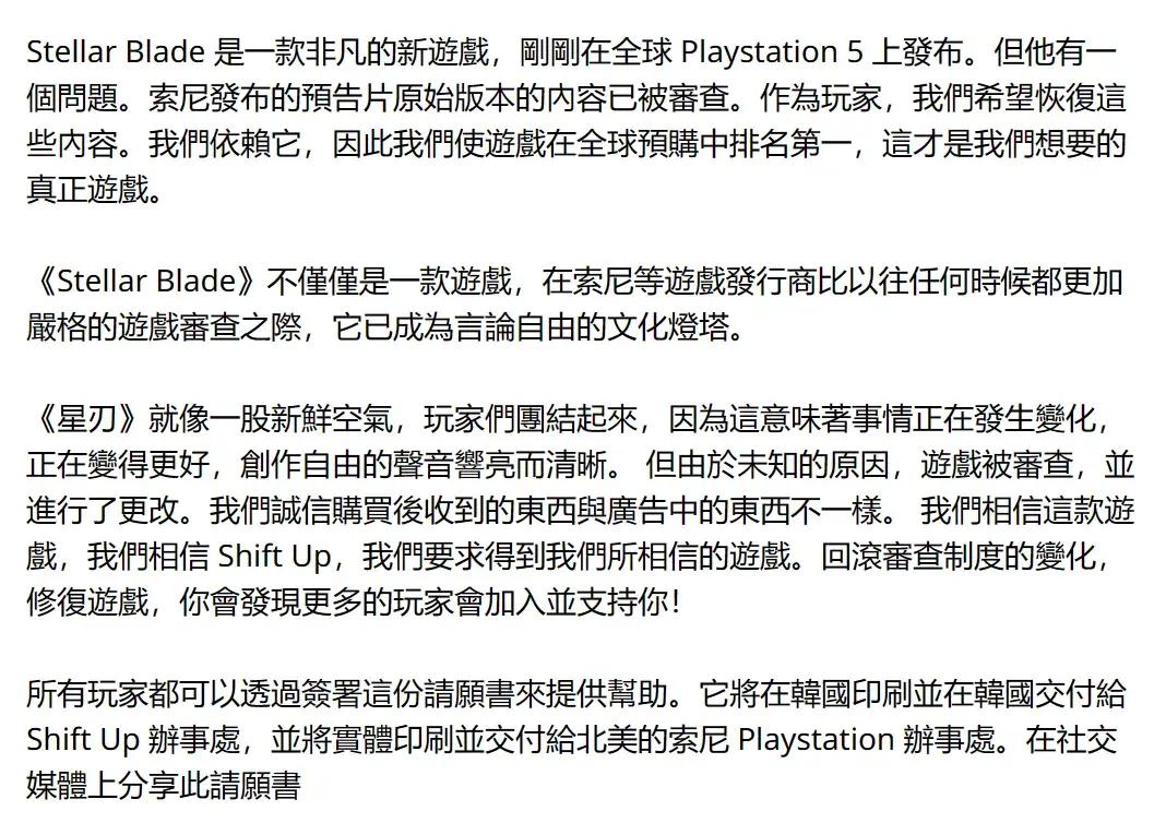另一位曾在暴雪工作,參與過《暗黑破壞神2》製作的遊戲人Mark Kern則發起了一場名爲“解放劍星(Free Stellar Blade)”的請願活動,他用多國語言將《劍星》稱爲“言論自由的文化燈塔”“一股新鮮空氣”,鼓勵玩家們來這份請願書上簽名,並在達到一定人數後將其交付給北美索尼Playstation辦事處,要求其撤回“和諧”補丁。