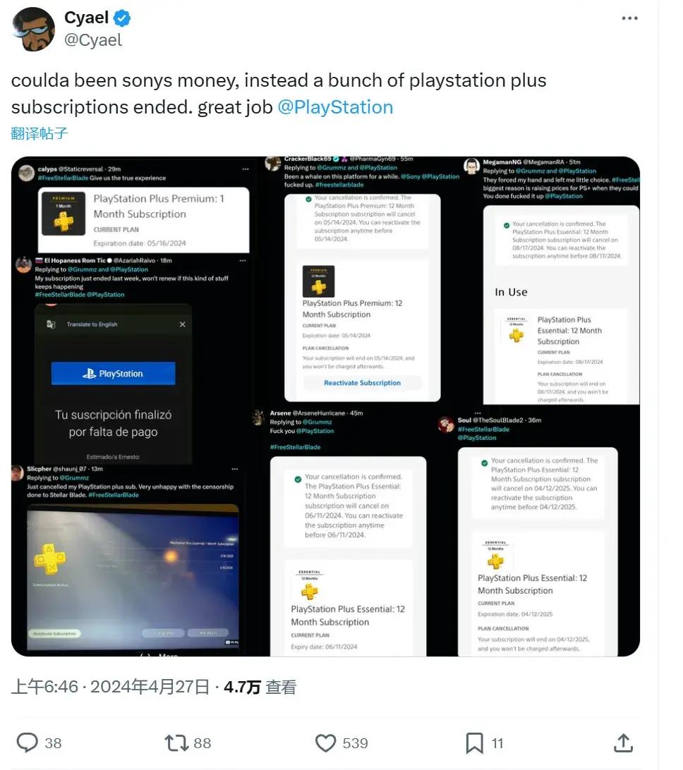 另一邊,部分玩家也大張旗鼓地停掉了自己續費的PSN會員,或是向客服發起爲《劍星》退款的要求,以此來抗議索尼在遊戲發售後追加審查的做法。