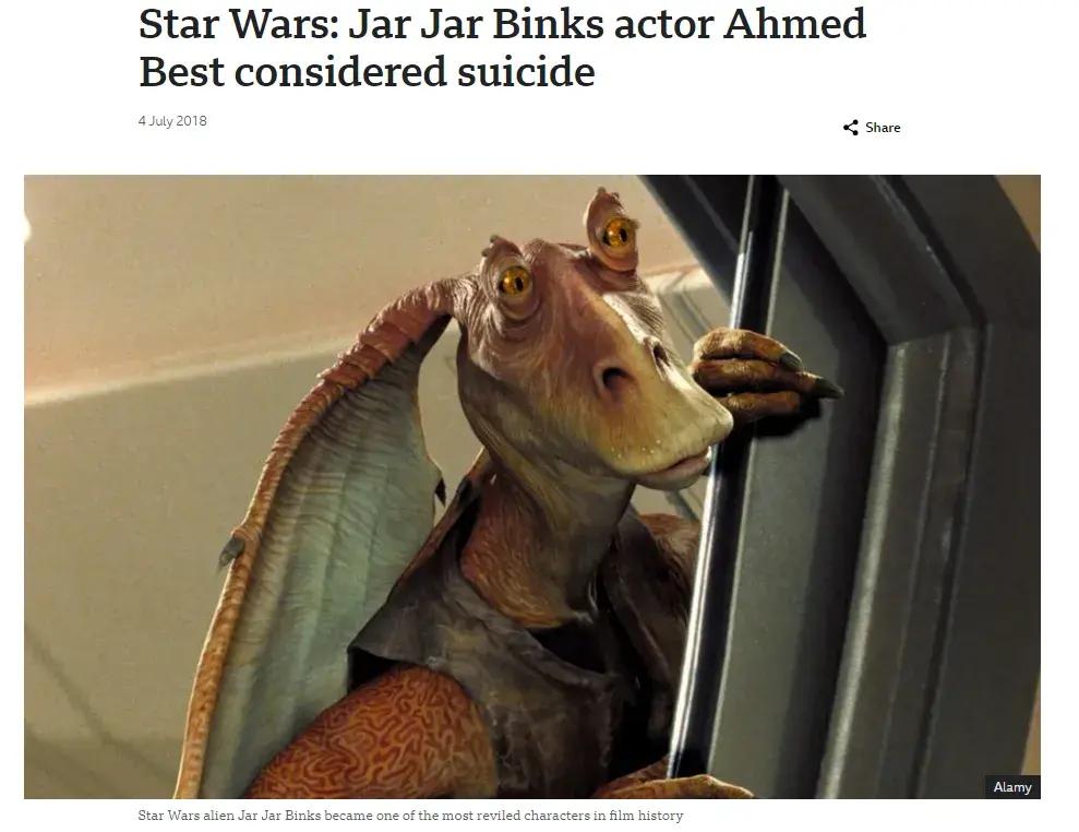 更別提在“原教旨派”星戰粉眼中,《星球大戰》前傳三部曲不管是特效運用、拍攝手法和敘事風格都和“正傳三部曲”有着巨大的差異,堪稱“異端”。而加•加這種偏向低齡化搞笑的角色更是“異端中的異端”,加•加的演員艾哈邁德•貝斯特也受到了各種極端激進觀衆的攻擊和騷擾,其坦言曾一度因此產生過輕生念頭。