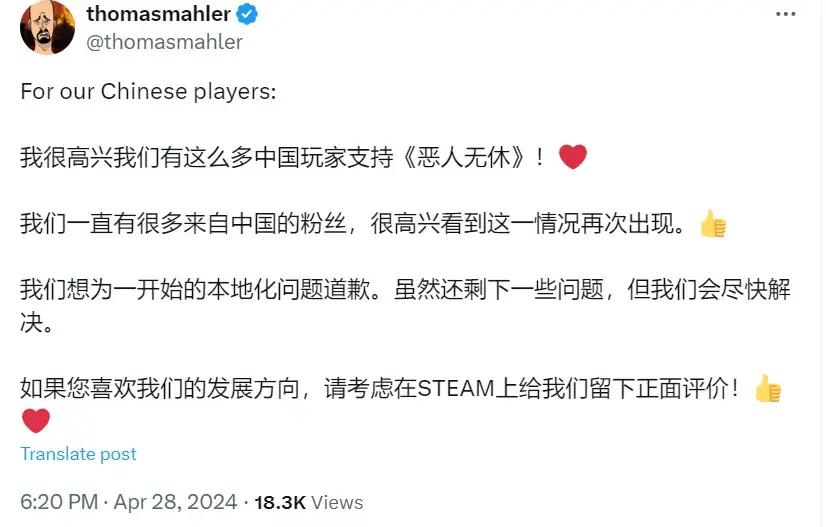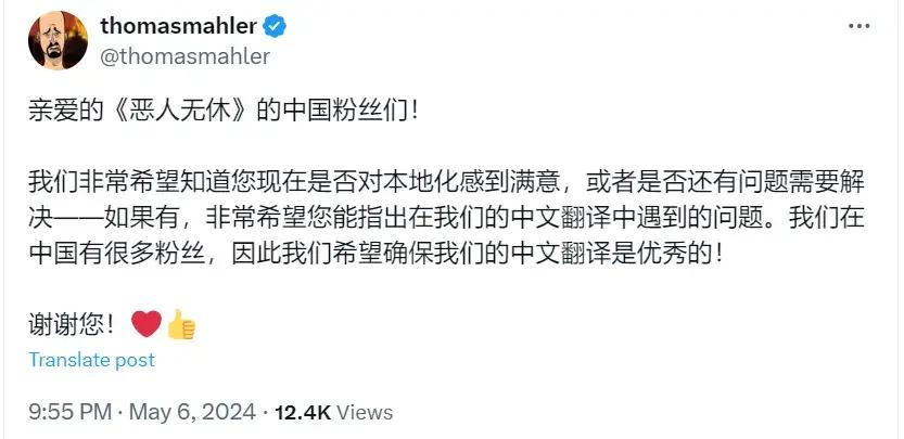 昨天,月亮工作室的CEO thomasmahler專門在社交媒體上發佈了一條中文推文,詢問中國玩家對最近改進的漢化效果是否滿意。儘管這段文字帶有明顯的機翻痕跡,但還是不難感受到其中的誠懇態度。