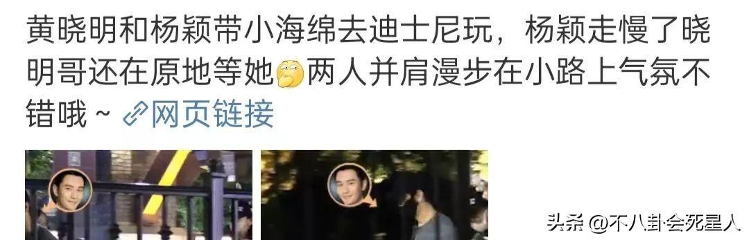 有狗仔放出黃曉明和楊穎帶兒子小海綿去迪士尼玩,楊穎走慢了,黃曉明還在原地等她。
