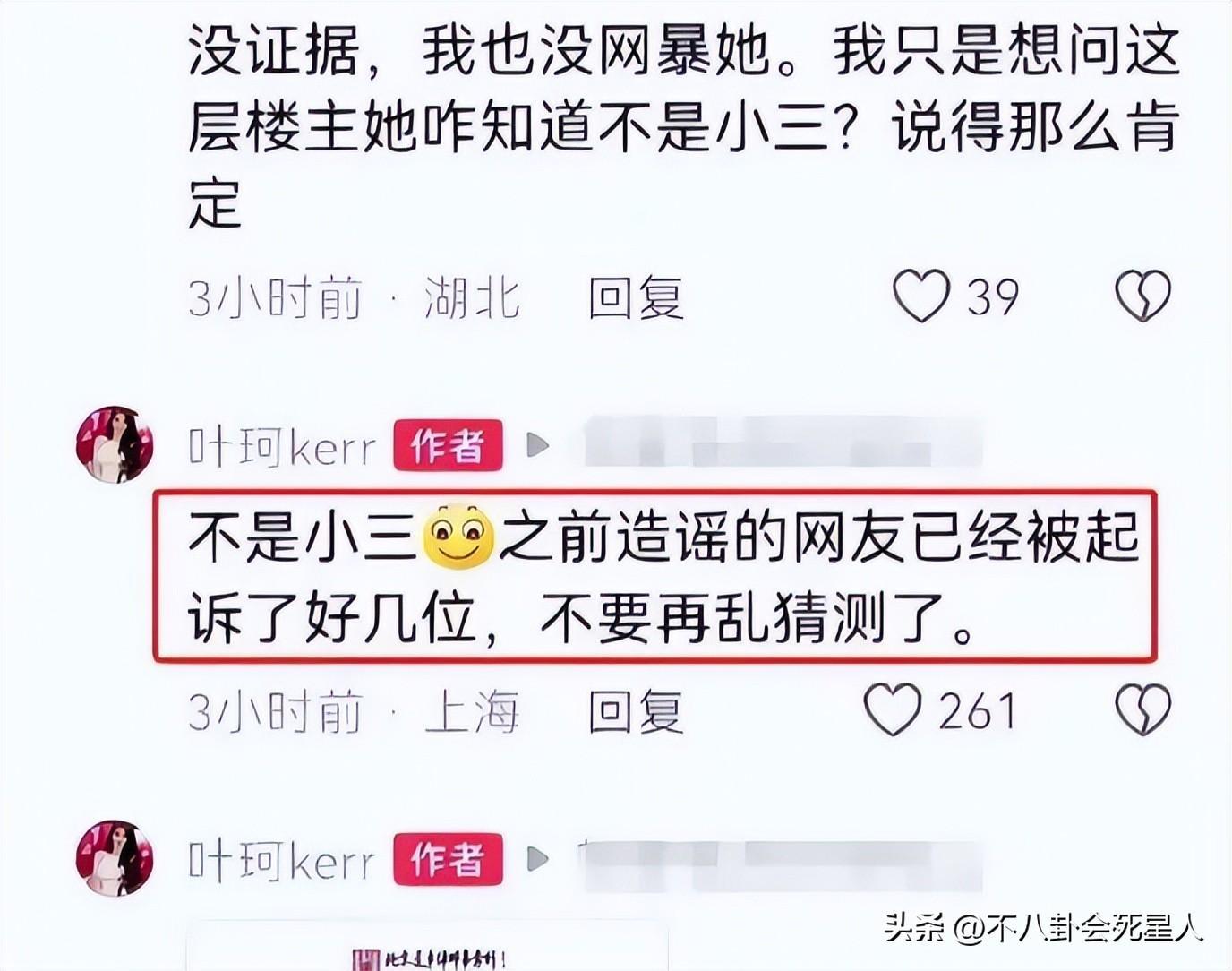 對此,葉珂回應否認是第三者,並表示如果再有人造謠,她會起訴對方,已經起訴了好幾個網友了。