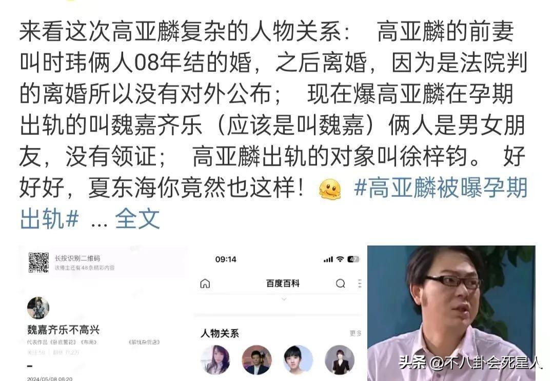看到這個瓜,很多網友一頭霧水,感覺摸不着頭腦,因爲高亞麟妻子是時瑋,這個魏嘉不知道是誰。其實,高亞麟與時瑋早已離婚,只是沒對外公佈,後來他和魏嘉在一起,沒想到在女方孕期出軌徐梓鈞。