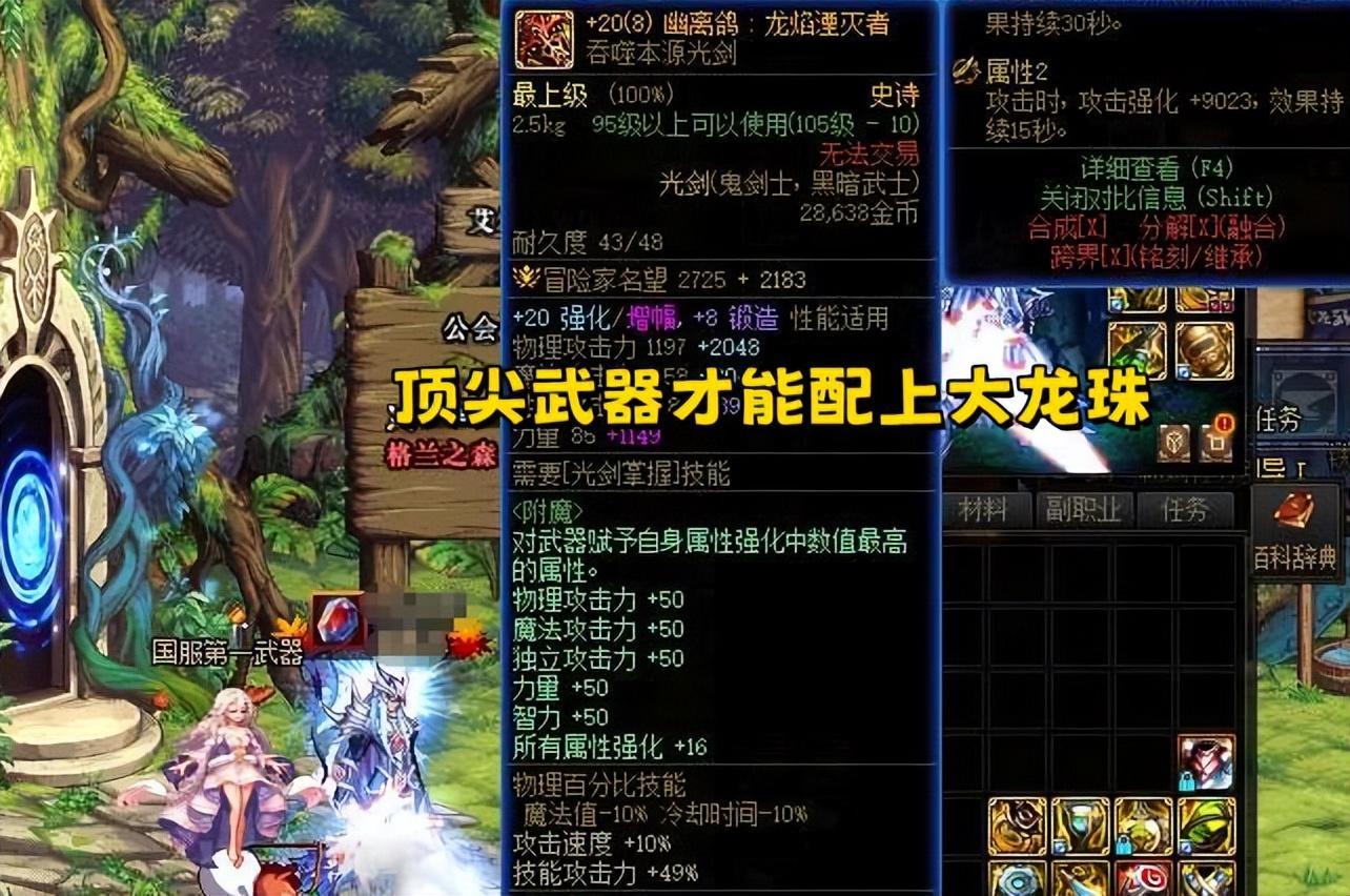 “龍珠”分爲大小龍珠,“大龍珠”增加「50三攻+50力智+16屬強,自帶屬性攻擊」,這就是現階段最頂尖最強的武器附魔;