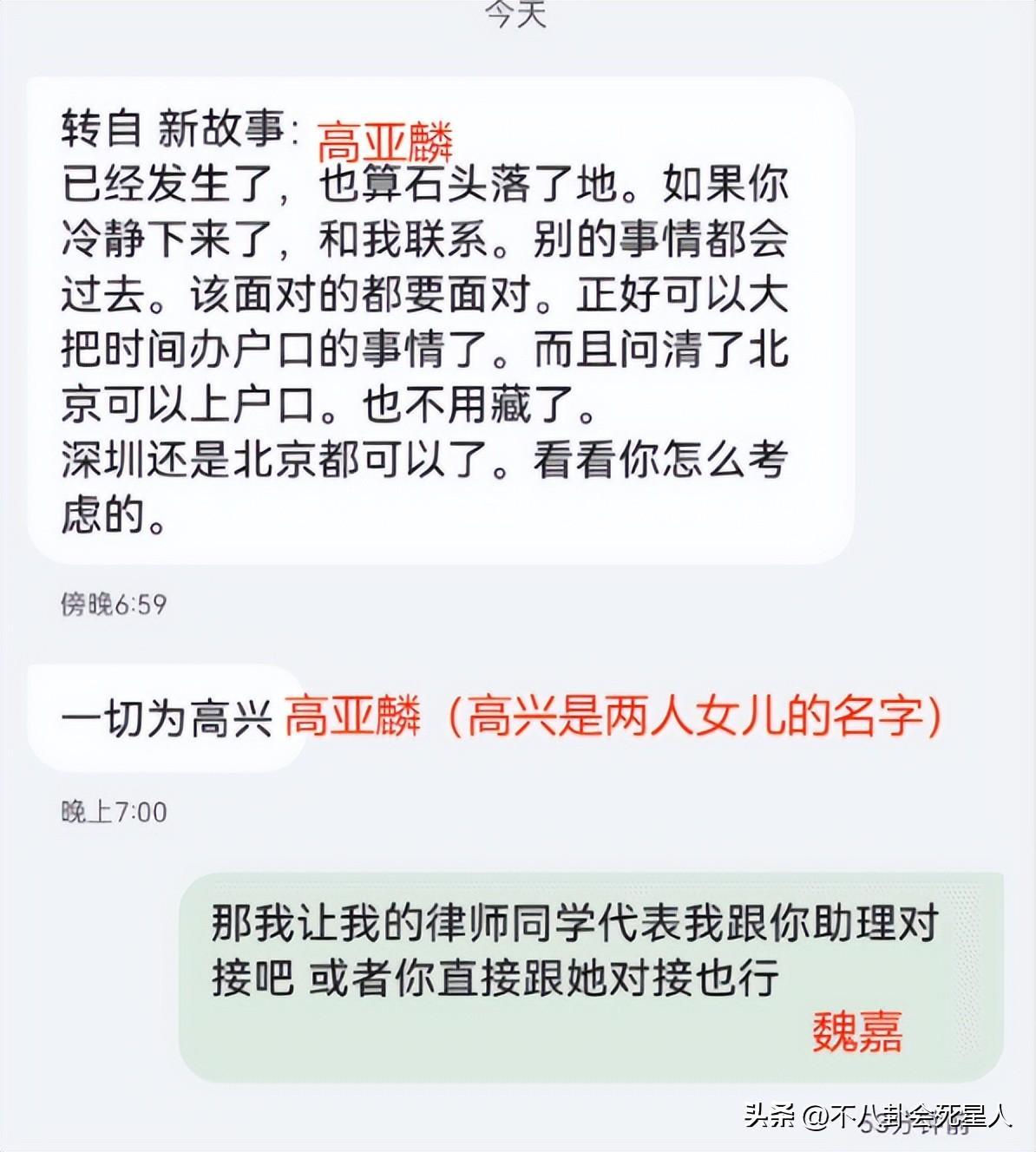 根據最新的發展,魏嘉曬出和高亞麟的聊天記錄,高亞麟承認了和魏嘉生了孩子的事情,還答應可以幫魏嘉給孩子上戶口。
