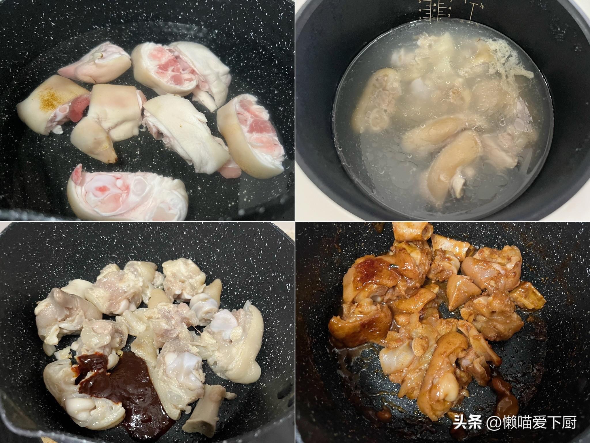 1、豬蹄斬小塊,冷水下鍋,煮出浮沫後撈出來洗淨;2、將豬蹄放入高壓鍋中,加適量熱水,壓至豬蹄變軟爛;3、起鍋燒油,下豬蹄,小火煸炒至兩面金黃,再加些現成的紅燒醬;4、炒至上色後,往鍋中加些煮豬蹄的水,能沒過豬蹄一半就行;5、大火煮開,轉小火煮20分鐘,再轉大火收汁即可。