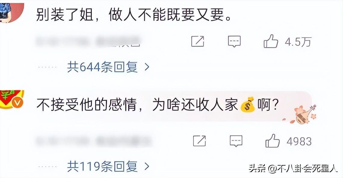 此話一出,讓喫瓜羣衆大爲震驚,這是什麼毀三觀的言論,既然不喜歡人家,爲什麼又要收對方的錢,評論區紛紛吐槽徐梓鈞太蠢,自己錘自己,三觀不正,典型的既要又要還要。