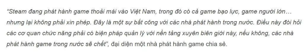 “Steam在越南自由地發佈遊戲,包括暴力遊戲和成人遊戲……但卻沒有申請許可。這對國內的遊戲發行商來說是不公平的,相關部門需要對這個跨國平臺進行管理措施,否則國內遊戲發行商將面臨困境。”