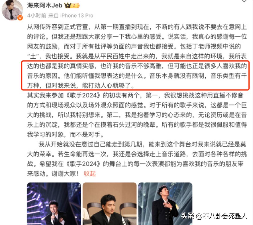 《歌手2024》播出後,海來阿木遭到了口誅筆伐,不少觀衆吐槽:他是誰?怎麼唱這麼土的歌?他憑什麼上《歌手》的舞臺?