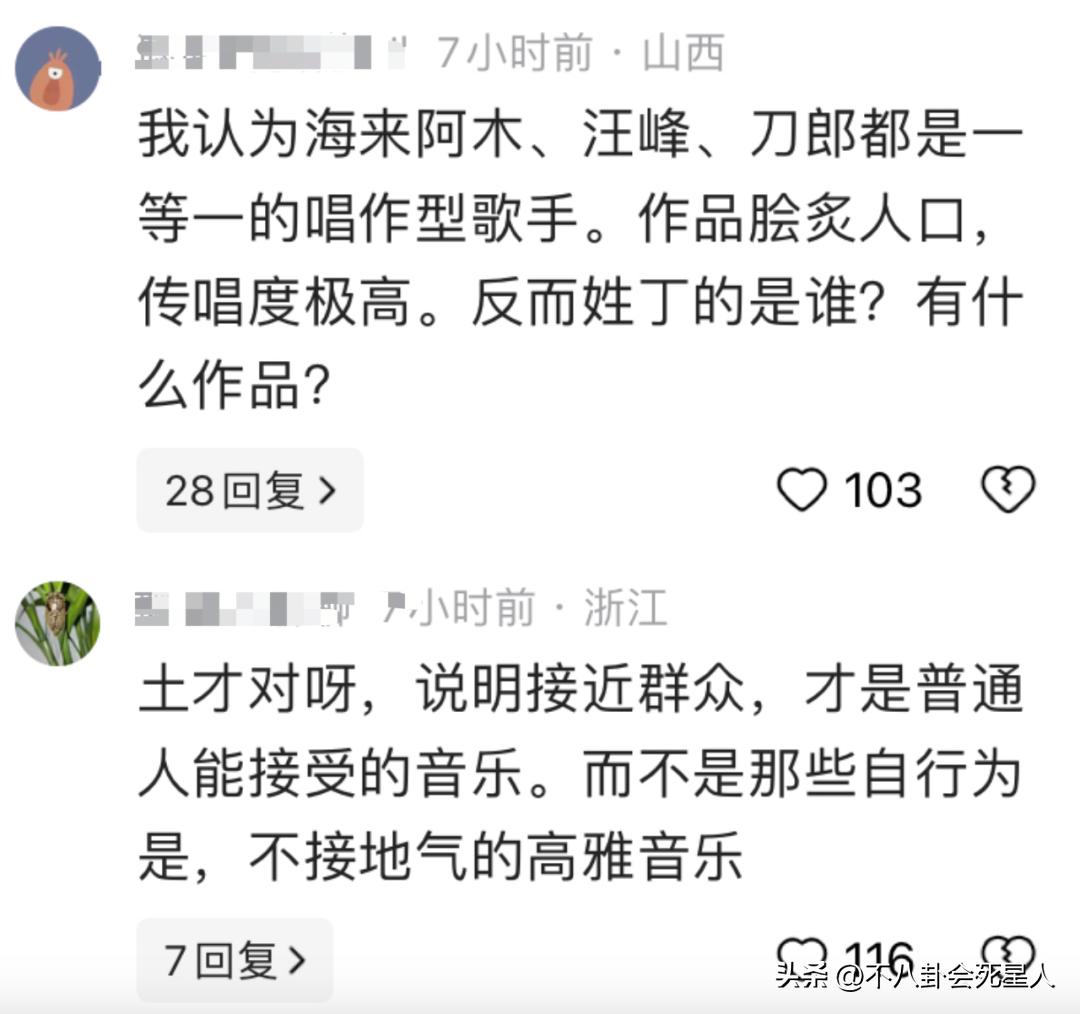 其中音樂人丁太升評價海來阿木:唱腔太土。