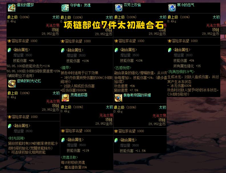 【項鍊-太初融合石】總共有7件太初項鍊,分爲對應“覺醒特化”“被擊減傷”“大恍惚”“特效流”“賭狗冷卻”“回藍”和“技攻”。