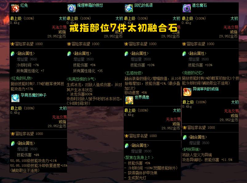 【戒指-太初融合石】同樣也有7件太初戒指,分別對應“賭狗77”“特效流”“大恍惚”“賭狗冷卻”“覺醒特化”“霸體冷卻”和“技攻”。