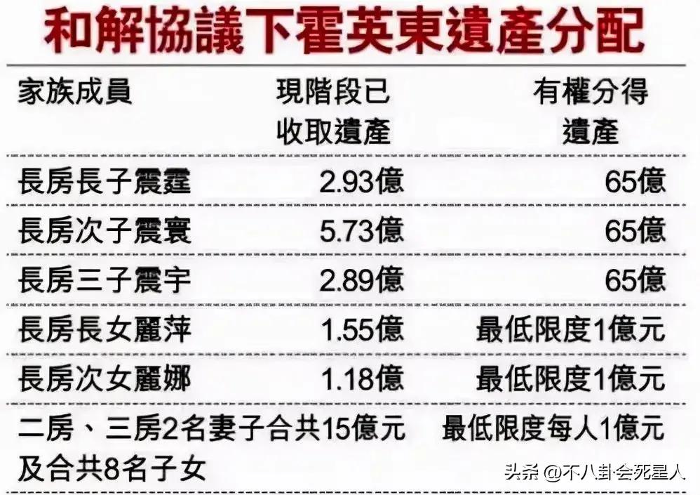 哪怕到了霍英東去世後,霍家的家族資產都並沒有被瓜分,霍家的成員主要以“每月領取生活費”的方式獲取霍家資產,中途雖然分過一次家,但霍震霆所在的長房三兄弟每人不過分到了65億元。