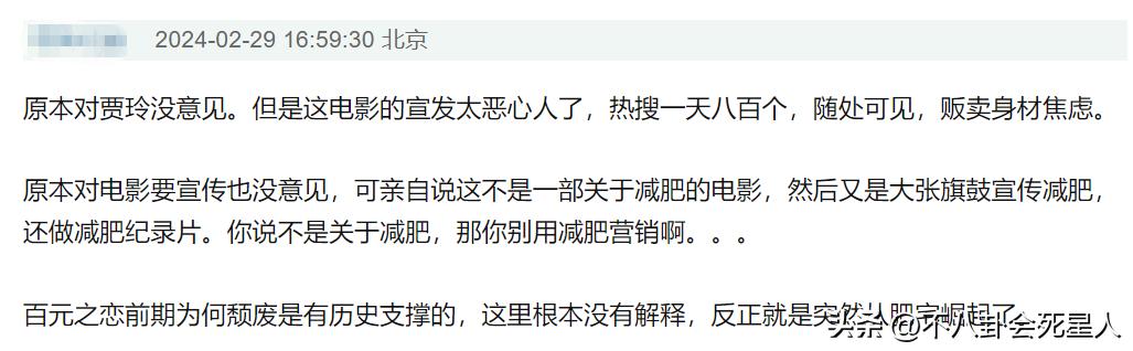甚至有網友質疑賈玲兩部電影中,一部“賣媽”,一部“賣減肥”,有網友把賈玲的遭遇稱爲“過度營銷導致的口碑反噬”。