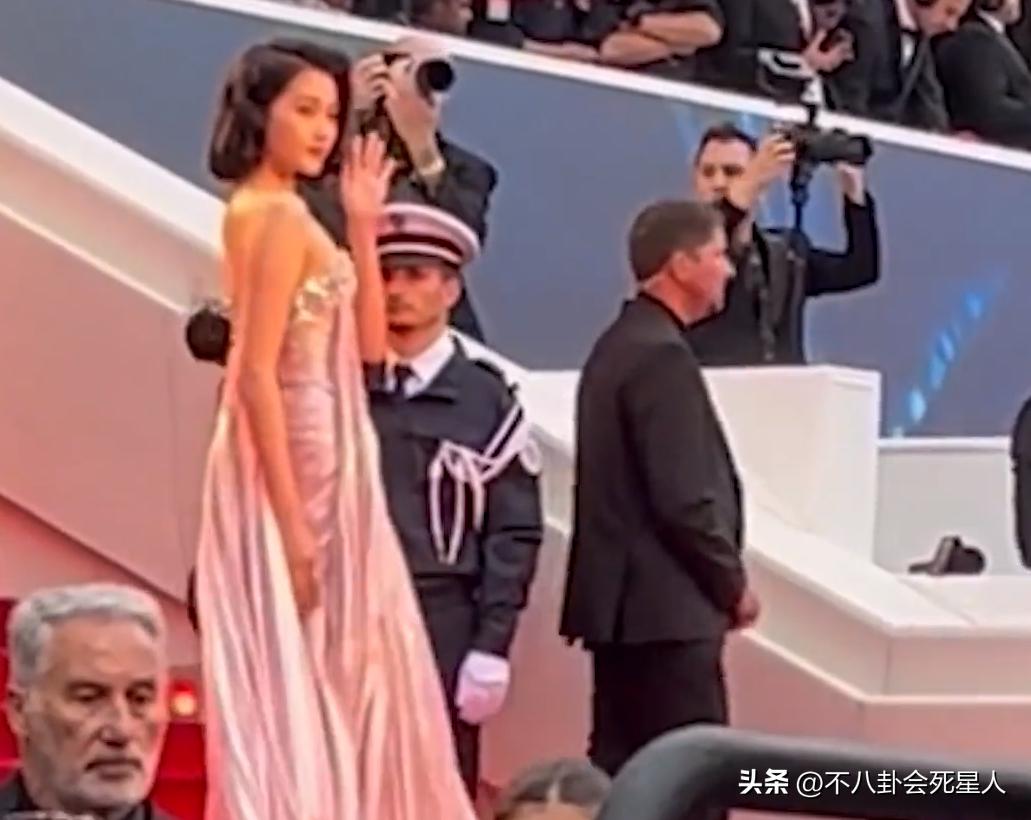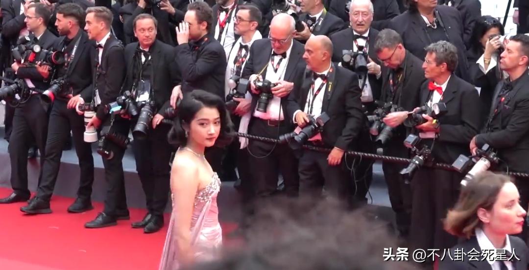 國內一線女星景甜去到戛納紅毯也沒有了特別優待,看她面前一排的攝像師都把相機放下來,幾乎沒有人在拍她。