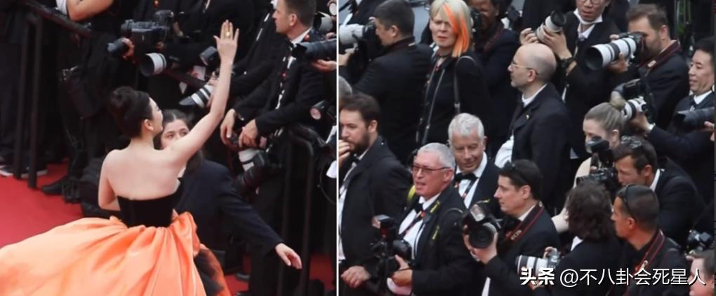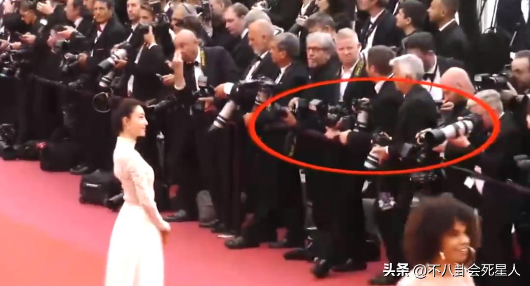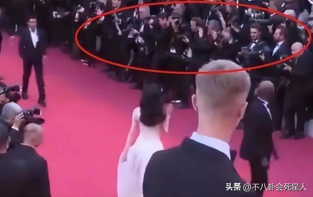 在戛納紅毯上被保安催促離開的例子可太多了。去年的戛納上,張雨綺盛裝打扮出場,一身橘色抹胸禮服誇張而搶眼,但仔細看,她前面的一排攝像師根本沒有把鏡頭對準她。