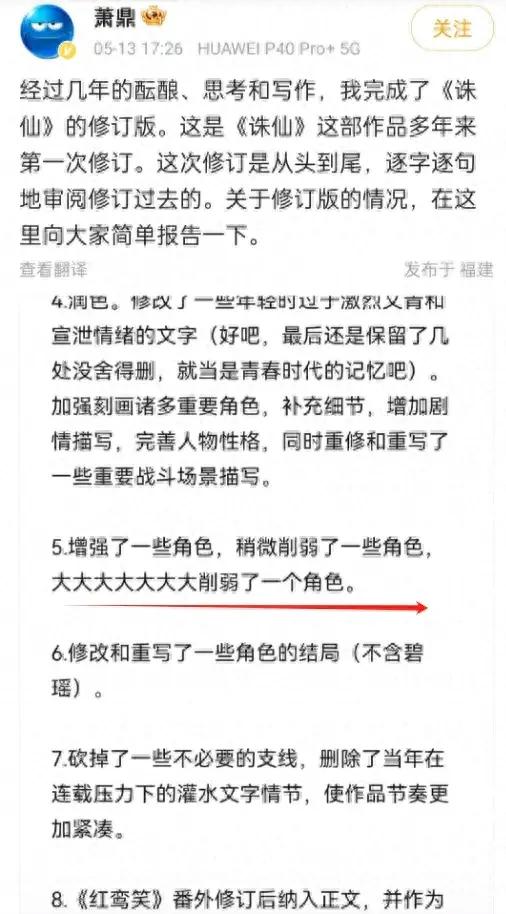 但就在該系列小說沉寂多年之後,作者蕭鼎卻突然在5月13日通過微博宣佈,他已對原作完成了修訂,並強調“大大削弱”了某個角色的強度。