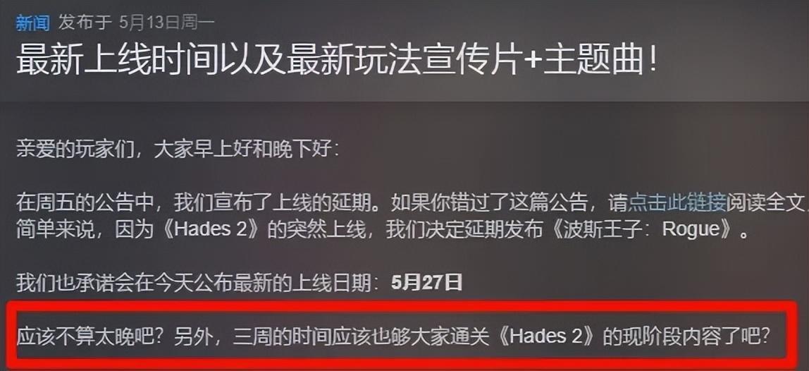 一週後的昨晚,當他們重新宣佈遊戲將在兩週後發售,也不忘在公告裏補上一句:“三週時間應該也夠大家通關《黑帝斯2》的現階段內容了吧?”