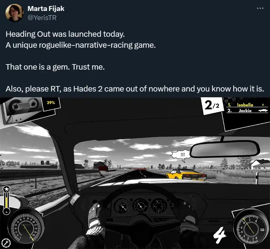 從邪典公路片汲取了靈感的遊戲《西部公路》(Heading Out),則是和《黑帝斯2》撞到了同一天發售。它的開發者在宣傳遊戲的同時,不忘吐槽一句:“另外請多幫忙轉發,因爲《黑帝斯2》突然就殺出來了,你們都懂吧。”