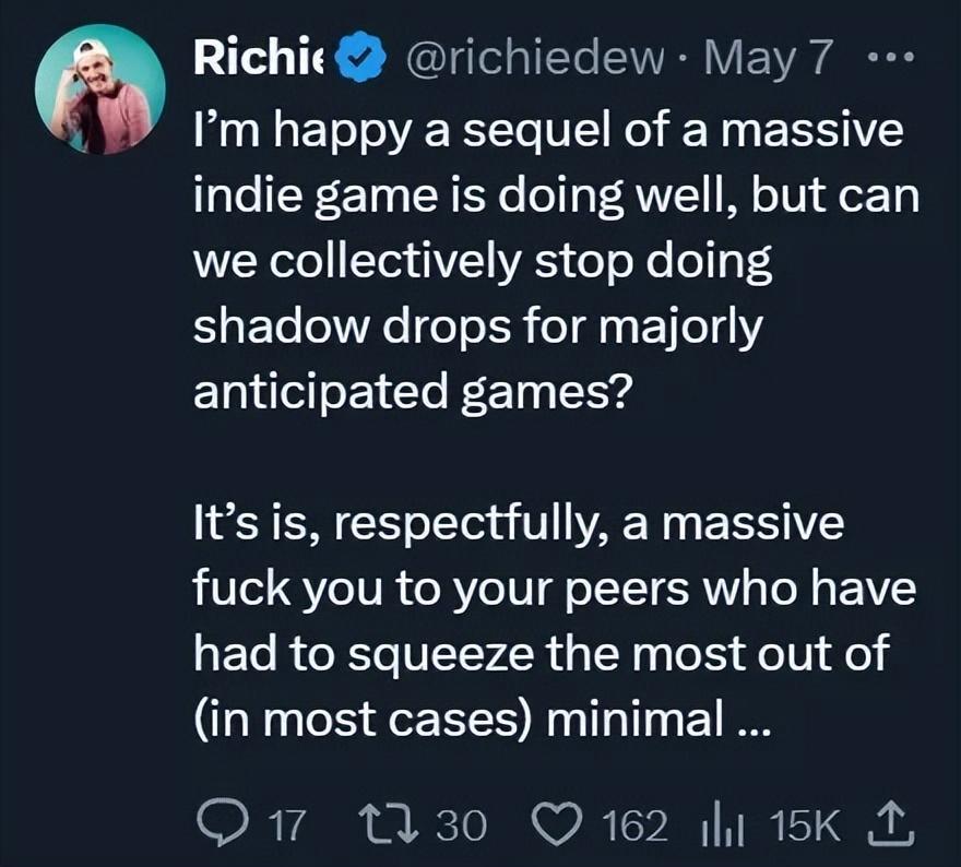 “我很高興一個大型獨立遊戲的續作能有不錯的表現,但我們能不能都別給備受期待遊戲搞突然發佈呢?(同一個檔期裏)還有很多獨立開發者,不得不以最低預算博得一些宣傳效果,這對他們來說實在太操蛋了……”