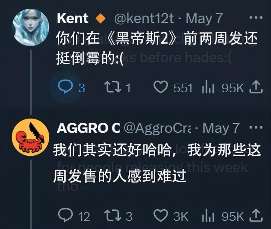 在他的推文下,很多同行都贊同了他的觀點:“想象一下你爲一款遊戲工作了3年,計劃好了一切,定下了發售時間,然後‘砰’的一聲《黑帝斯2》出現了,吸引走了所有人的注意力。”還有人粗暴地總結爲“市場調研很重要,尤其是《黑帝斯2》什麼時候發售”。