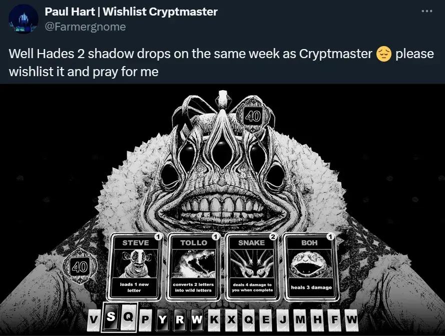 《Cryptmaster》是一款完全靠言語控制的地下城冒險遊戲,已經在5月9號發售。在得知《黑帝斯2》發售後,開發者在推特上說:“《黑帝斯2》空降到同一周了,請幫忙加下願望單併爲我祈禱。”還配上了一個皺眉的表情。