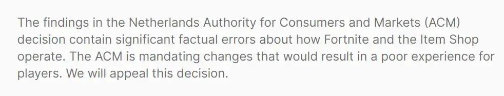 對此,Epic也發佈了一篇回應ACM的聲明,Epic聲稱ACM的調查結果存在關於《堡壘之夜》和遊戲商店運營方式的重大事實錯誤,ACM要求的變更將導致玩家的體驗變得糟糕,他們將針對ACM的決定提出上訴。