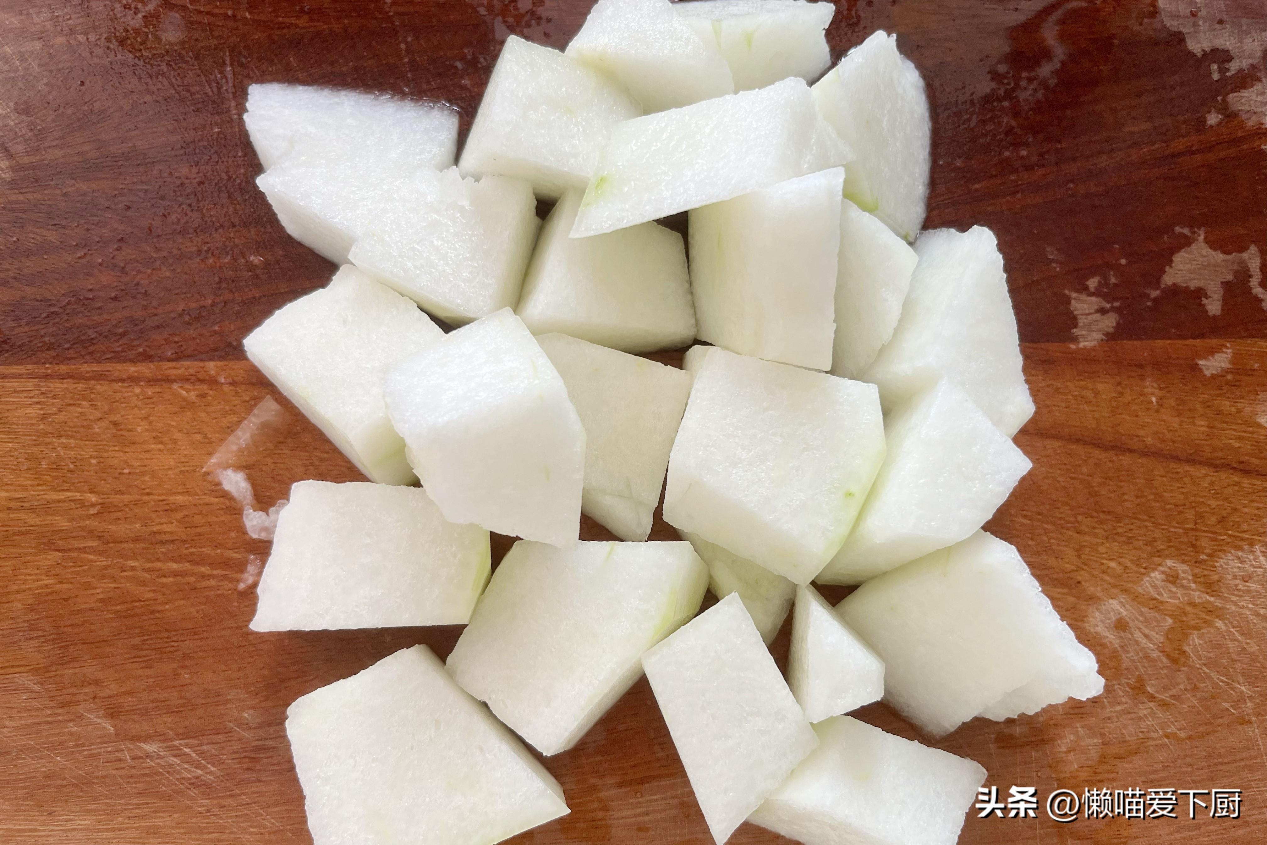 2、冬瓜去皮、去瓜瓤後,切成大一些的塊狀,避免煮的時候煮爛了;