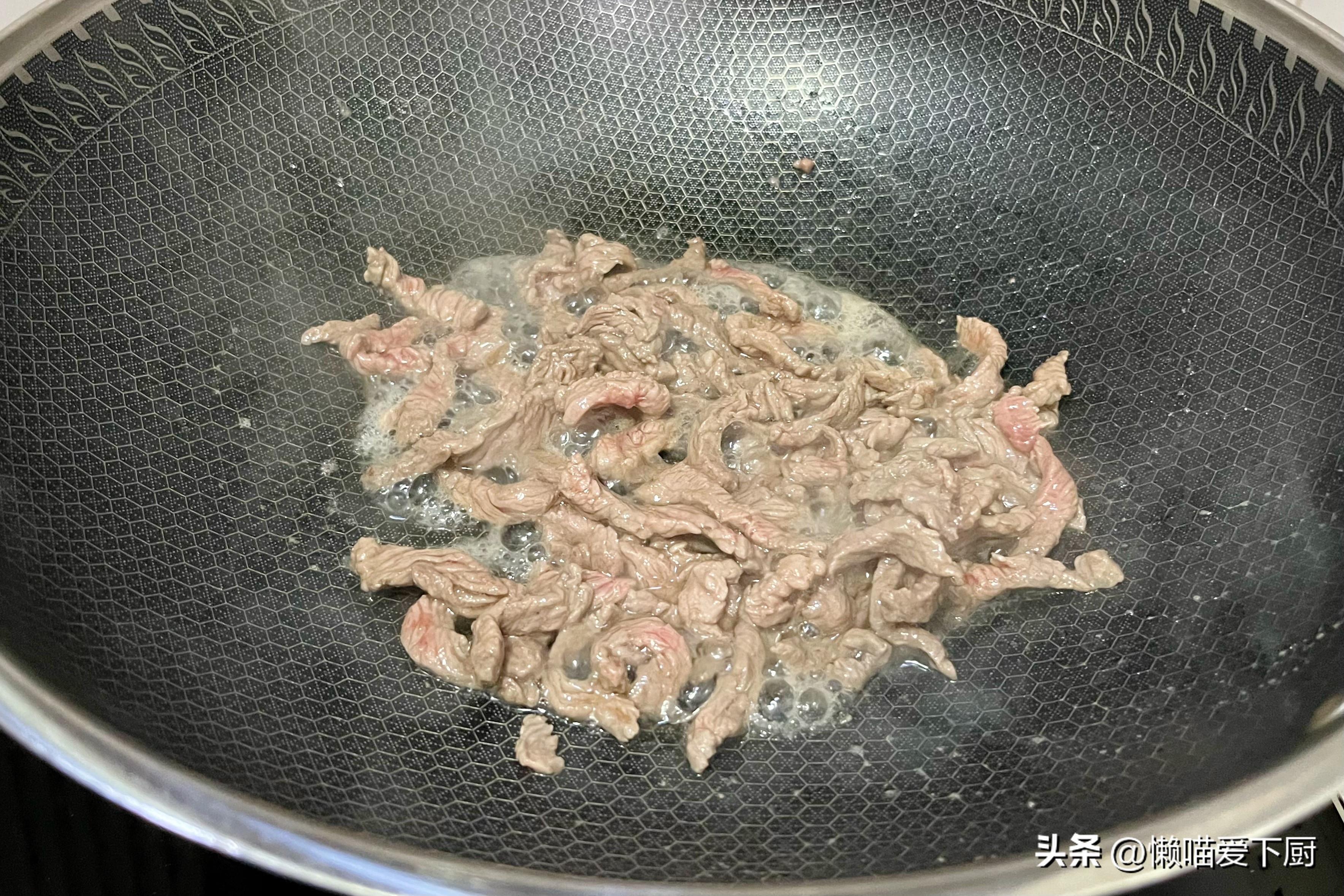 2、鍋中加油,下入牛肉,大火翻炒至變色後盛出來;