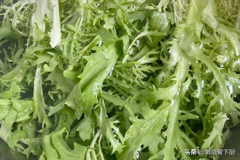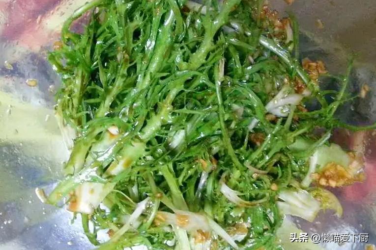 2、往苦菜里加些炸蒜末、生抽、香醋、芝麻香油調勻即可。