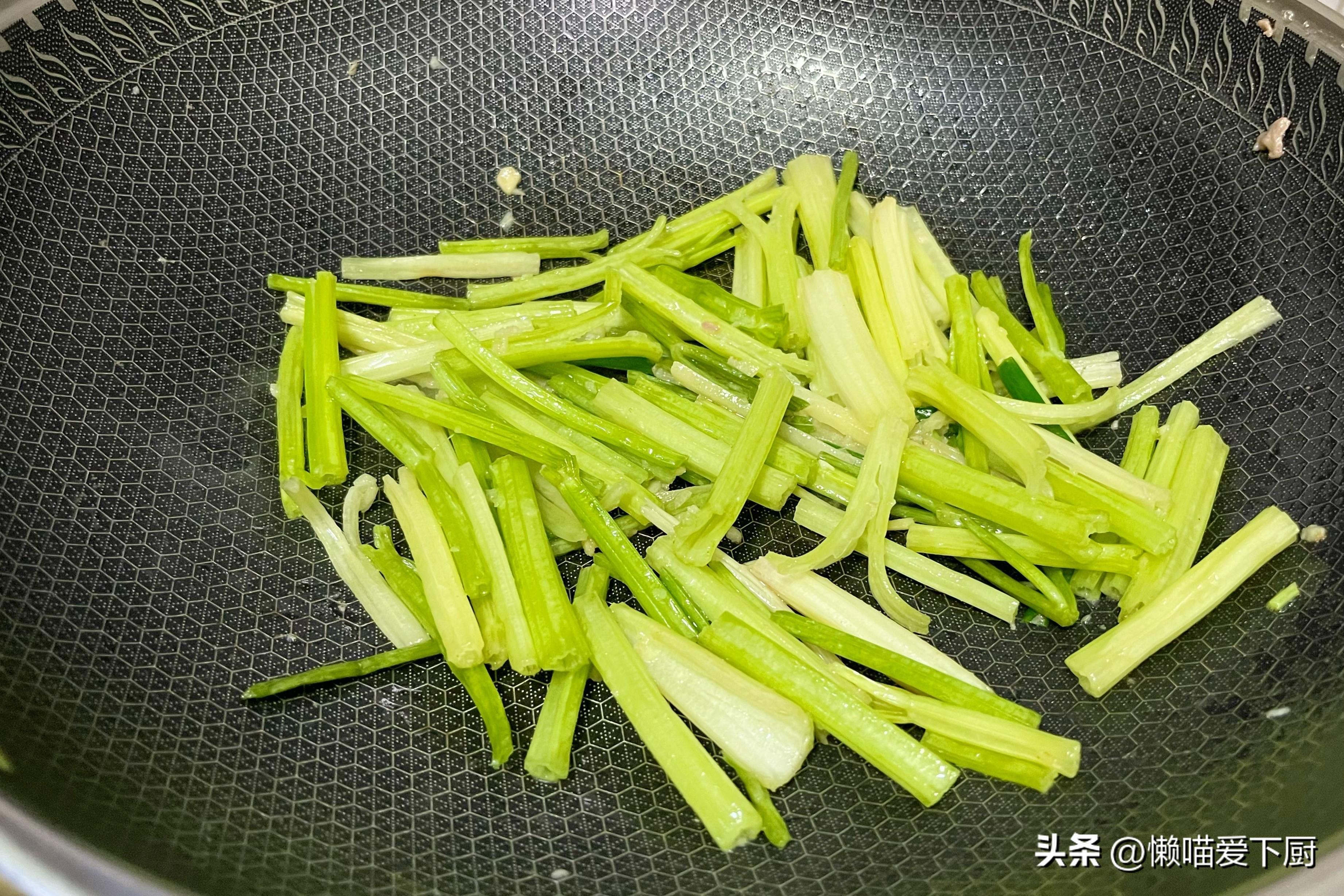 3、鍋內留有底油,下薑絲、蔥段、蒜末炒香,再下入芹菜;