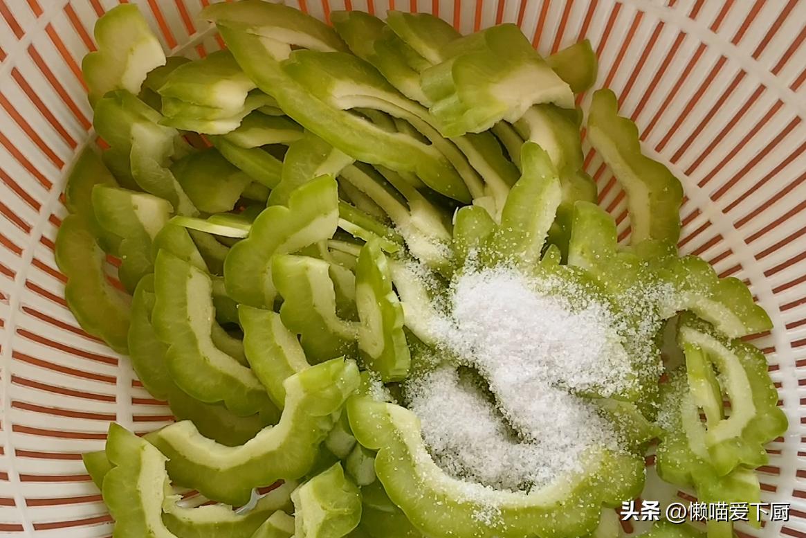 1、苦瓜切薄片,加2勺食鹽,抓勻醃製10分鐘,再撈出來洗淨;