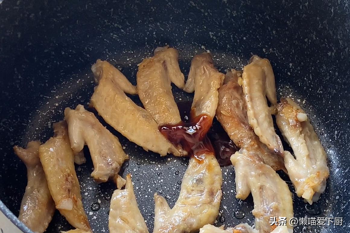 4、另起鍋加油,下蒜末爆香,倒入雞翅尖,不斷煸炒至變金黃色,加些生抽、蠔油炒勻;